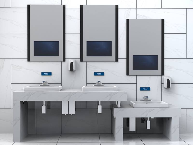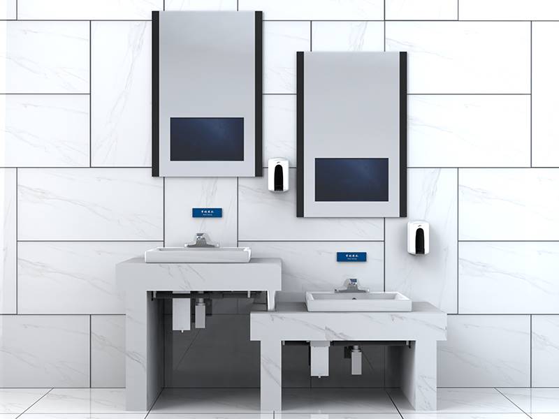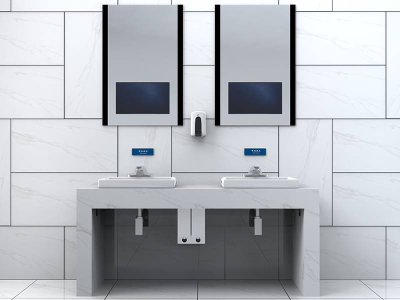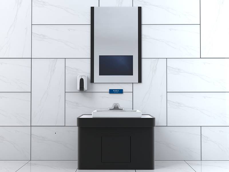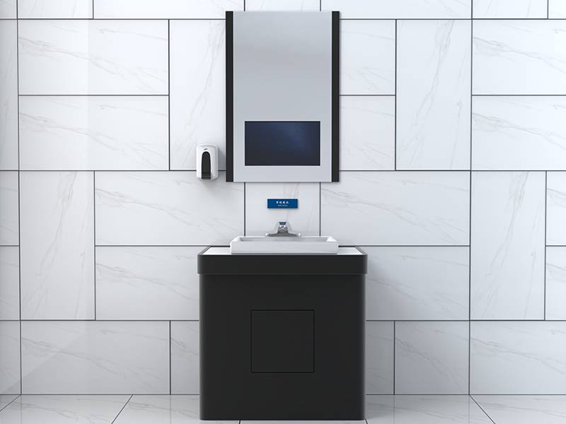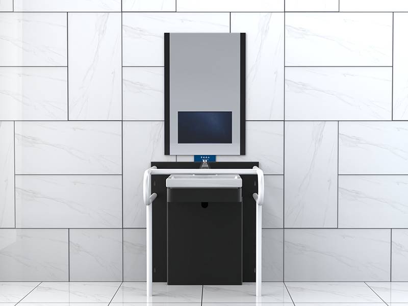 المكونات: إطار حوض الغسيل من الفولاذ المقاوم للصدأ؛ حنفية الماء بدون لمس (تعمل بحساس الأشعة)؛ مرايا الحمام مع مصابيح إضاءة. والملحقات الأخرى؛